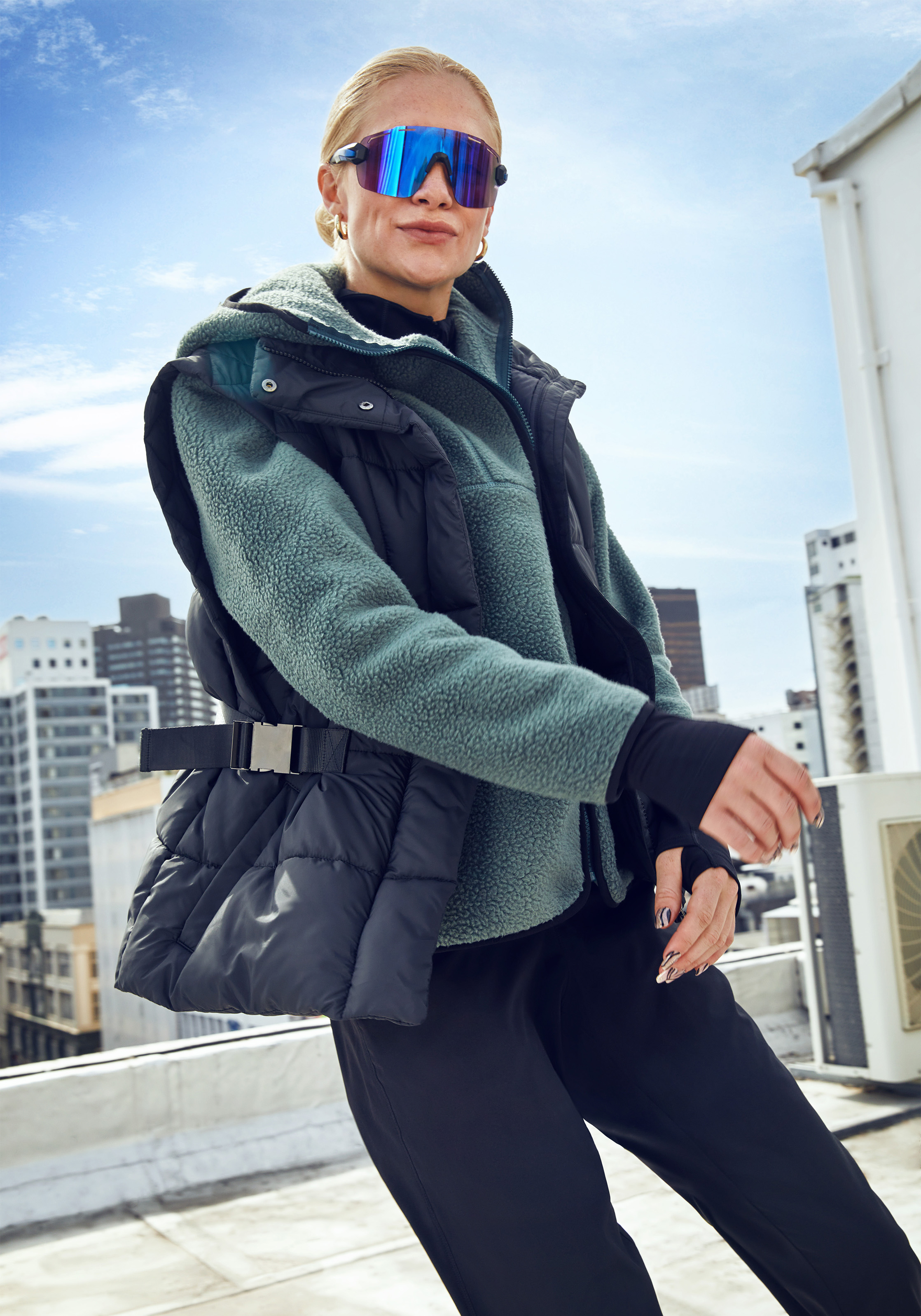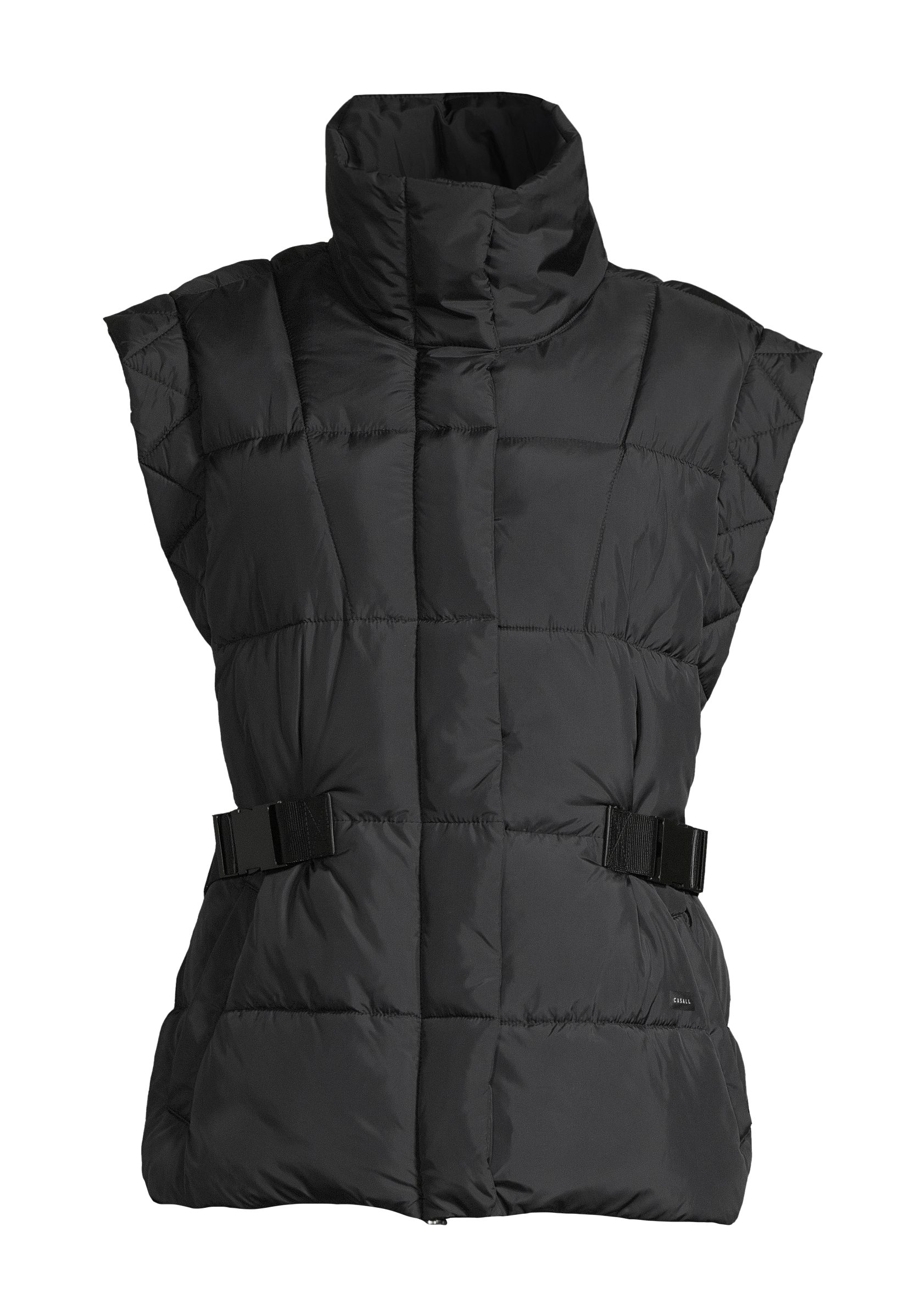 Die perfekte gesteppte Weste für den Herbst in der Stadt! Oversize mit hohem Kragen, sieht sie großartig aus, wenn sie über einem Hoodie oder Fleece gestylt wird. Die Schnallen und der Kordelzug machen es einfach, die Passform nach Ihrem Stil anzupassen.