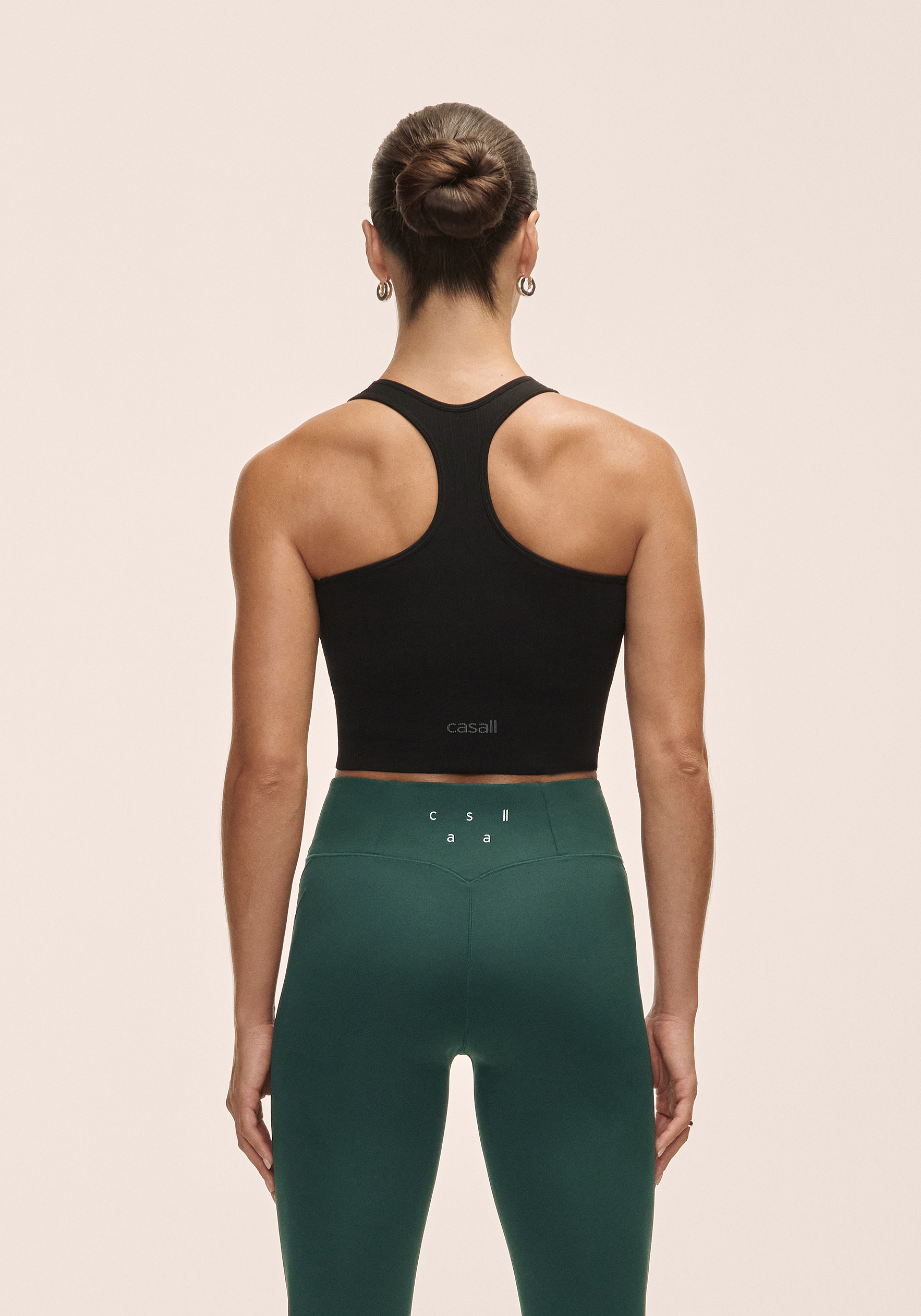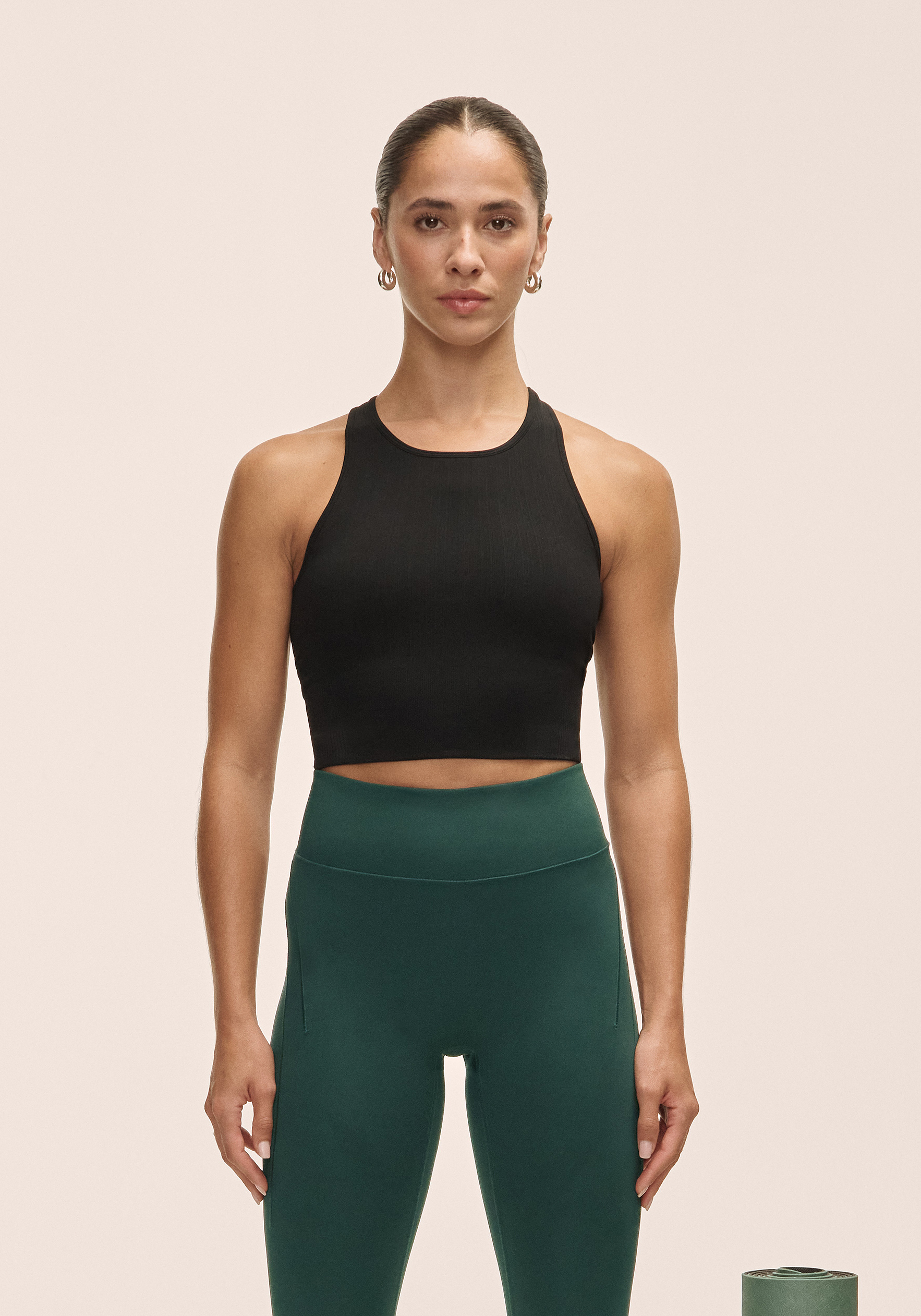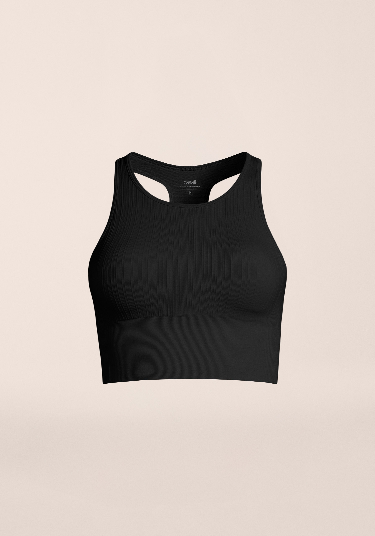 A stretchy, light support sports top in a seamless rib knit. Designed for yoga and studio training and comfy enough for everyday too! Featuring a fashionable, irregular rib and racerback design.