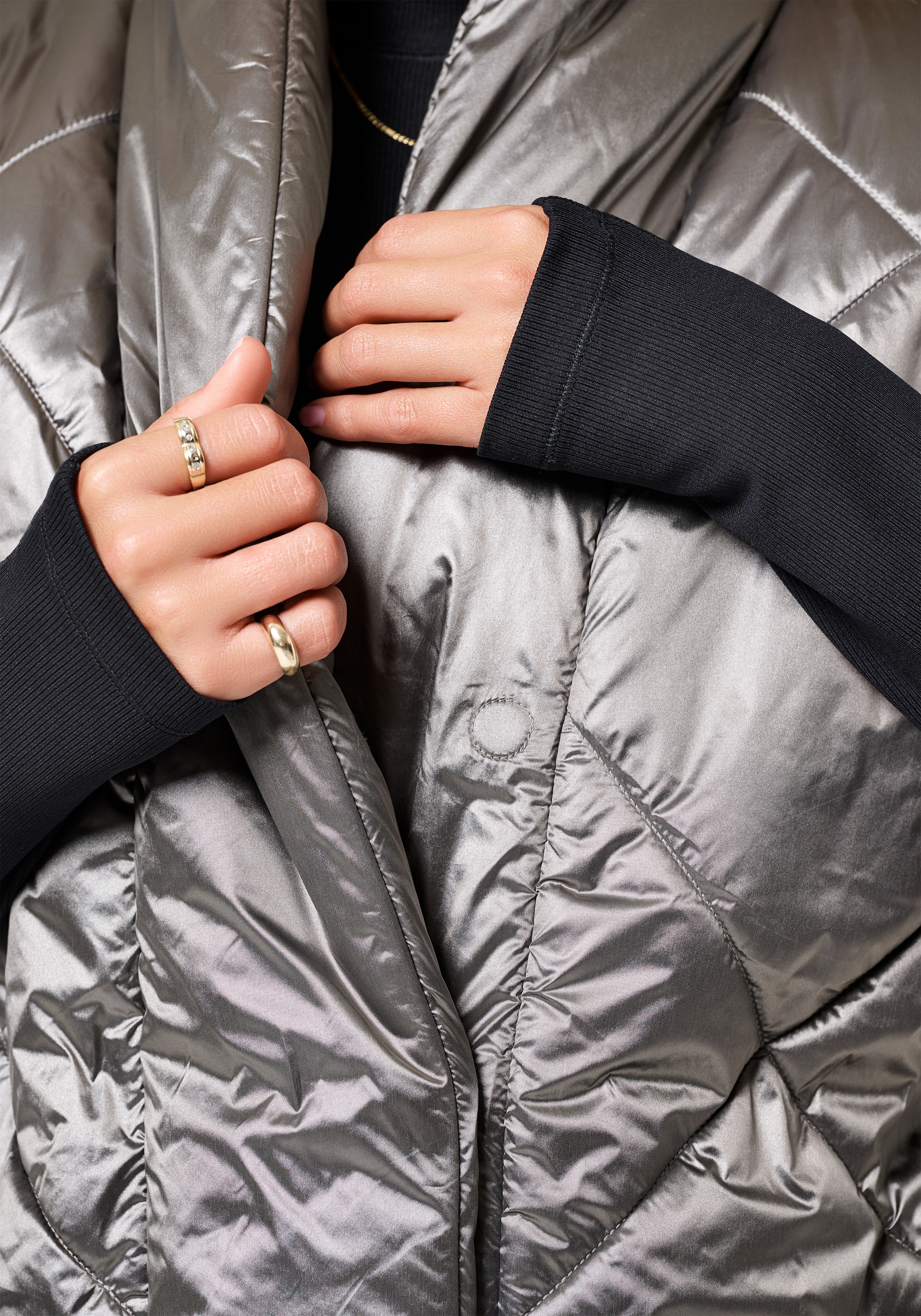 Outer fabric: Light and shimmering 100% recycled polyamide with a fluorcarbon free water repellent surface. Lining: 100% recycled polyamide. Padding: Down like 100% Sorona® polyester, of which 25% is bio based.