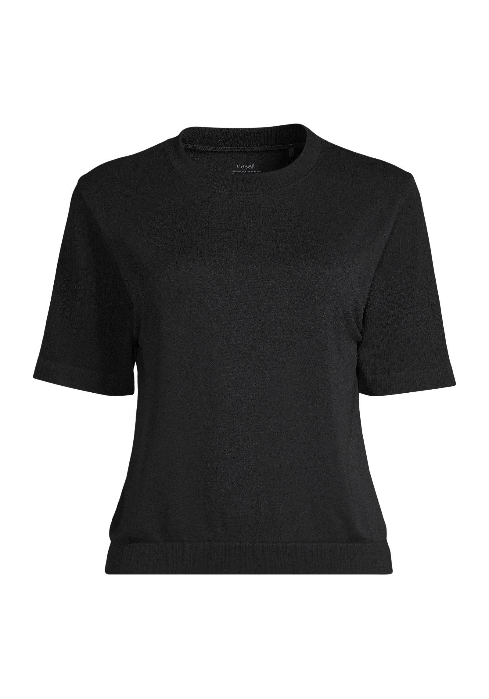 Soft seamless knitted material in a flat knitted body and slightly irregular rib structure at sleeves, neck and bottom with good stretch and stability.
