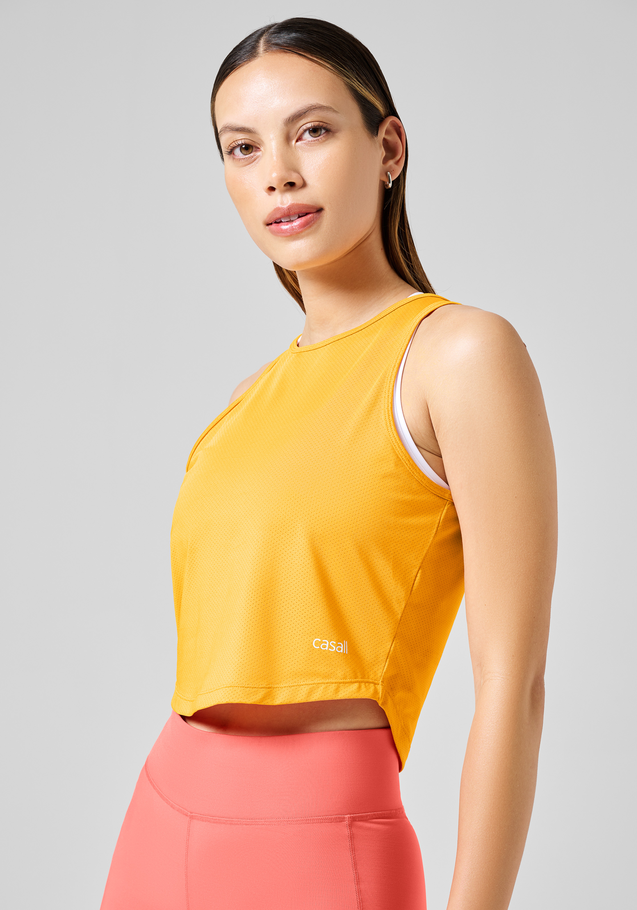 Minimalistisches Trägershirt mit einer kurzen, eng anliegenden Passform. Gefertigt aus recyceltem Mesh-Gewebe, das weich, leicht und dehnbar ist. Das Trägershirt hat einen hohen Ausschnitt und einen abgerundeten Saum. Perfekt für härtere Trainingseinheiten, da das Material Feuchtigkeit effizient ableitet und dich trocken und kühl hält.