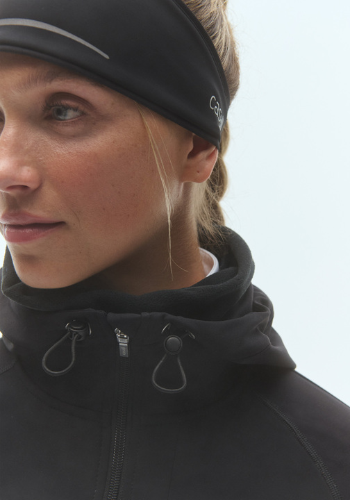 Windtherm Running Jacket, med huva och hög krage, är förstärkt med ett vindblockerande och vattenavvisande parti framtill samt har optimerad temperaturreglering. Bär den tillsammans med matchande Windtherm Tights för löpning och träning utomhus under de kallare säsongerna.