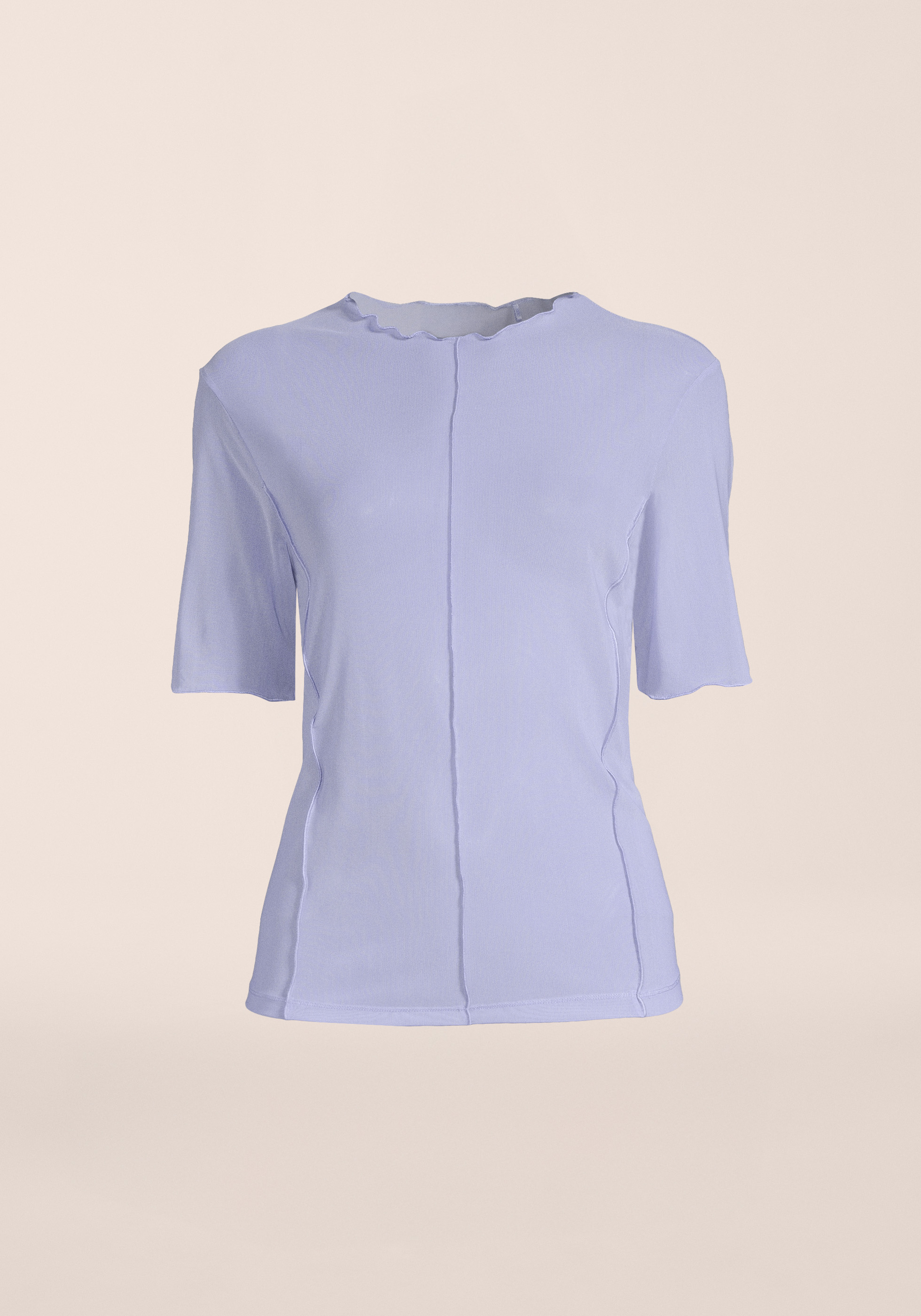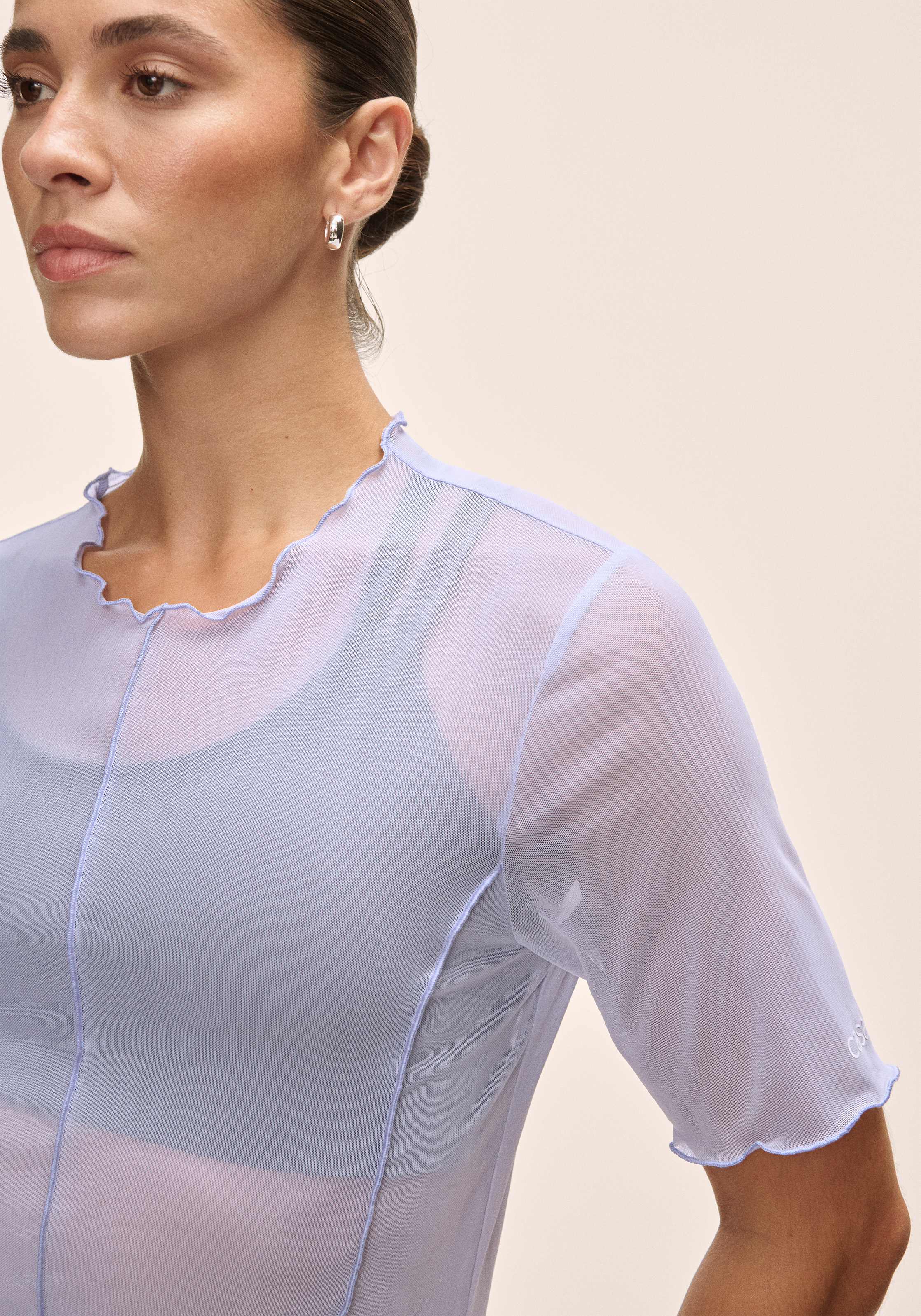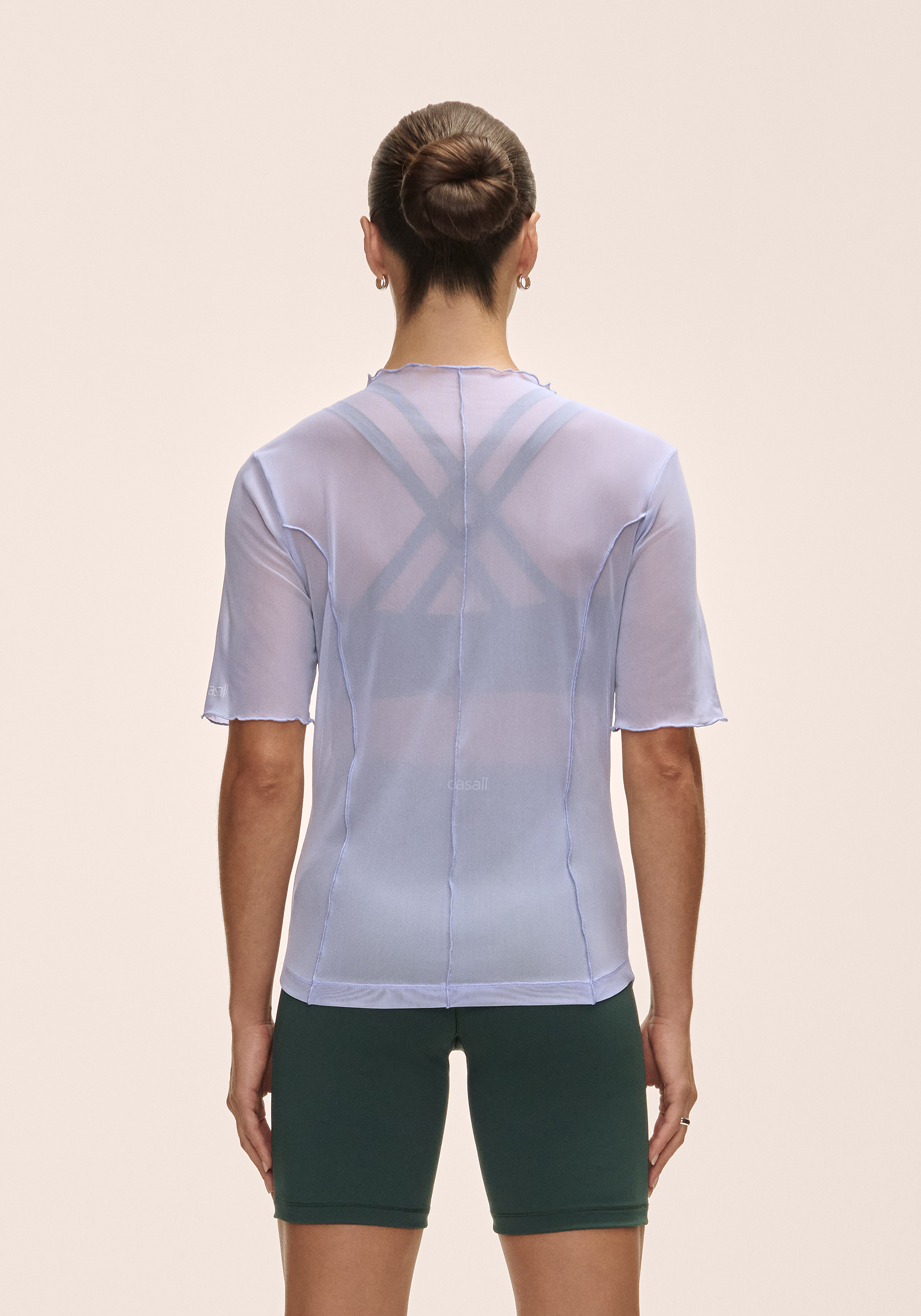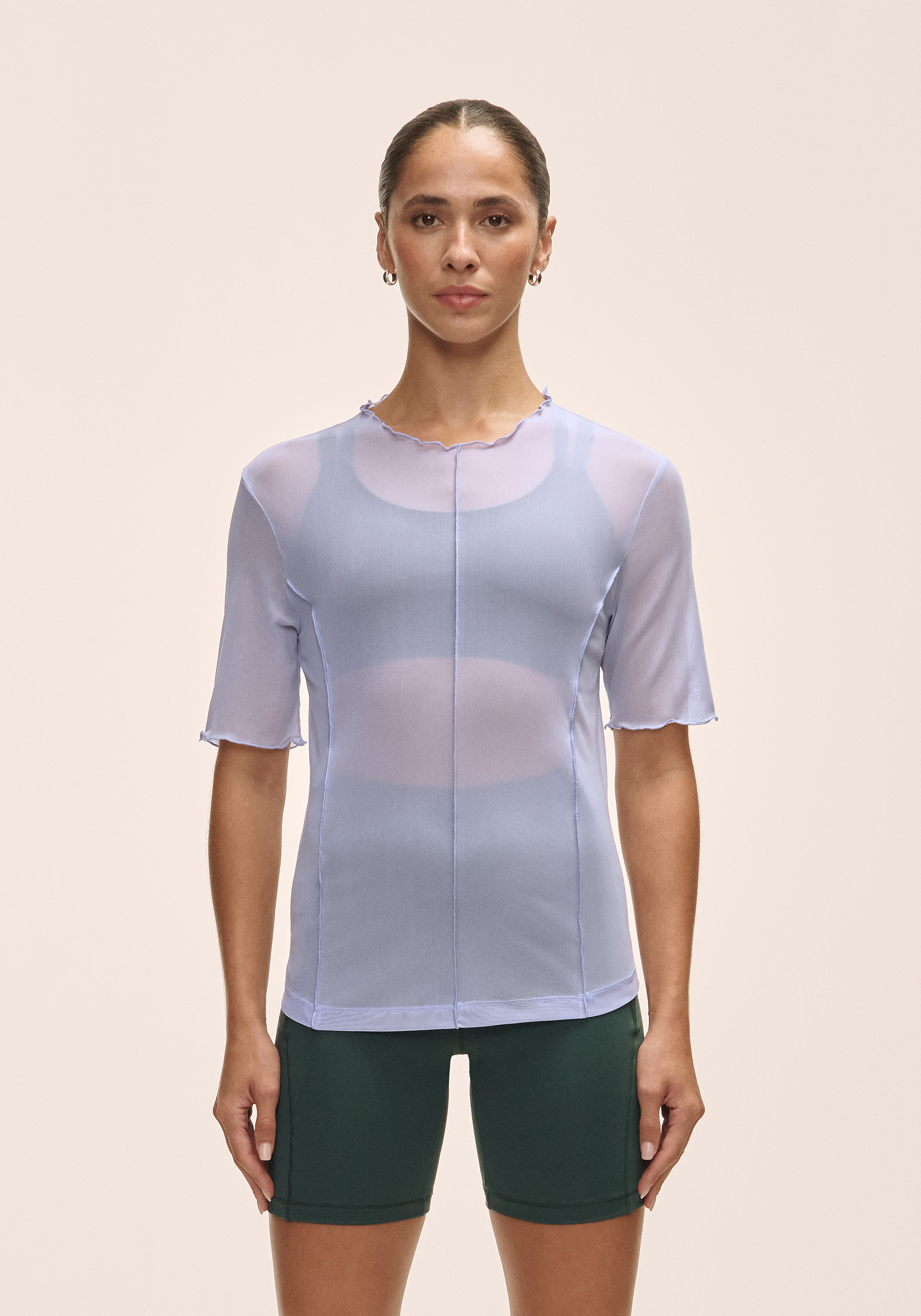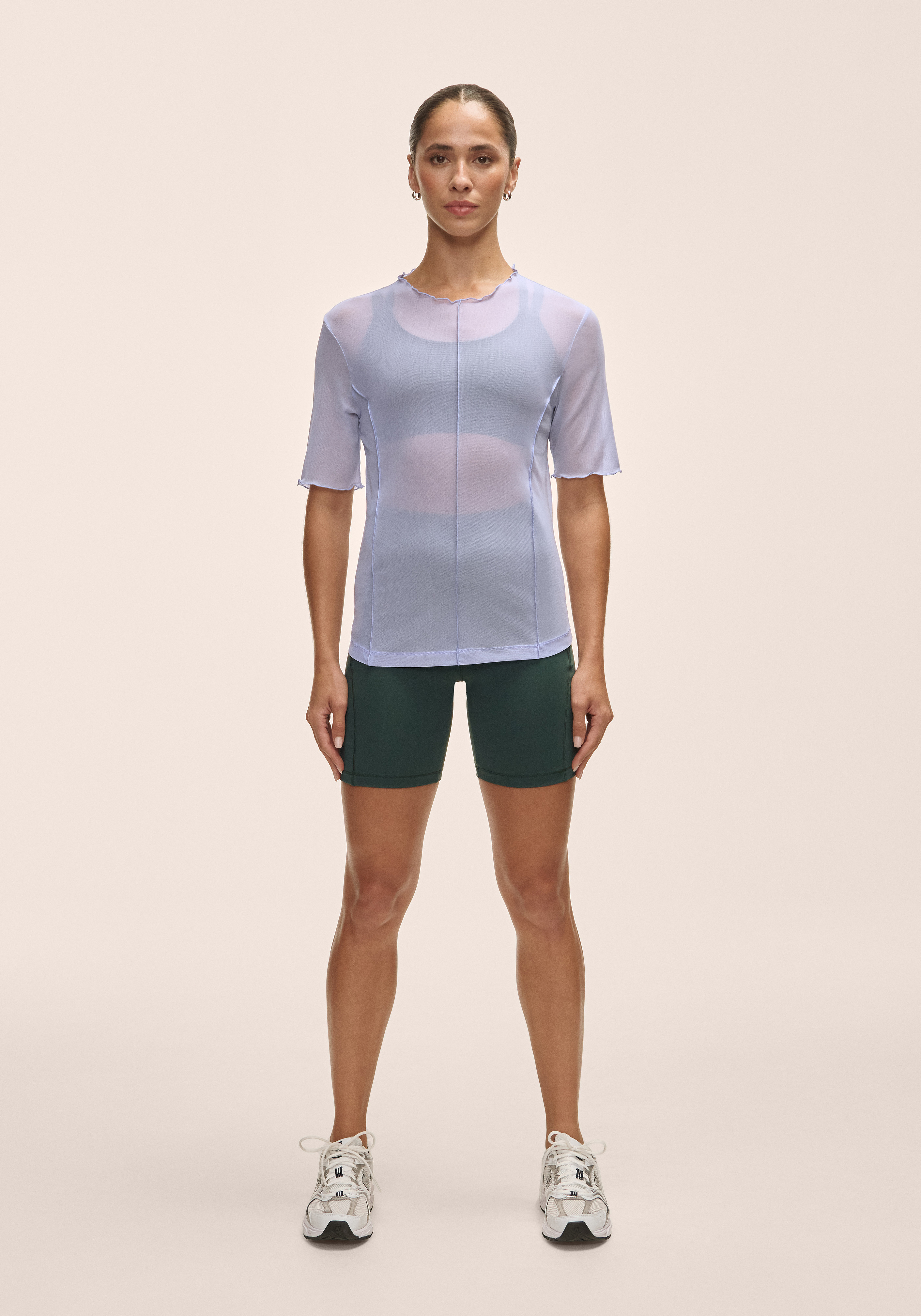 T-shirt i luftig mesh med dekorativa sömmar som ger ett formande intryck. Tillverkad i en skir men slitstark mesh med 50% återvunnen polyester. Denna T-shirt är designad för att sitta nära kroppen med en hög halsringning och rullfållar. Designad för svettiga pass!
