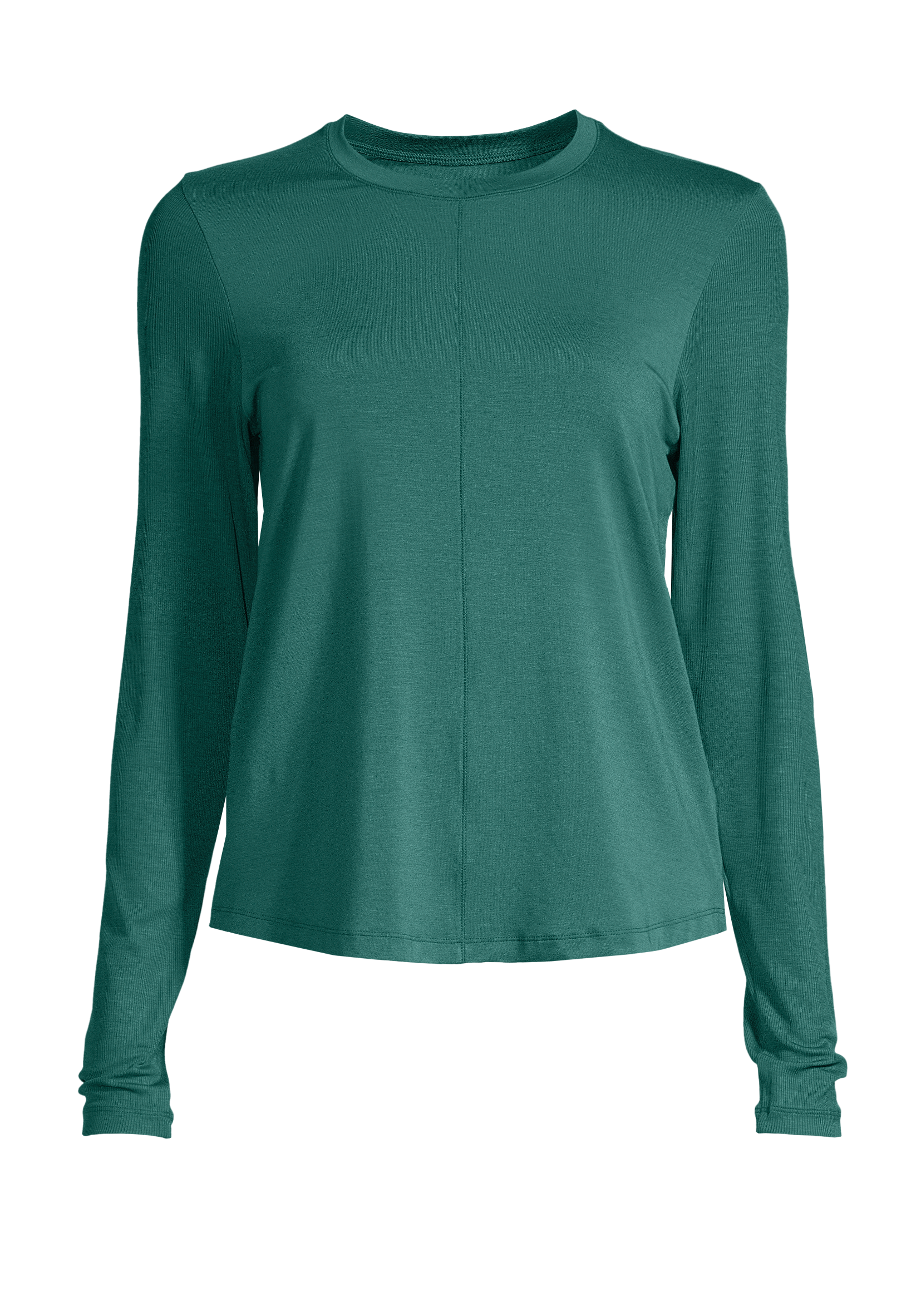 Denna tunna, ribbstickade långärmade tröja är lätt och mjuk mot kroppen, ett perfekt vardagsplagg. En söm fram och något rundad nederkant tillför en snygg form till en klassisk tröja.