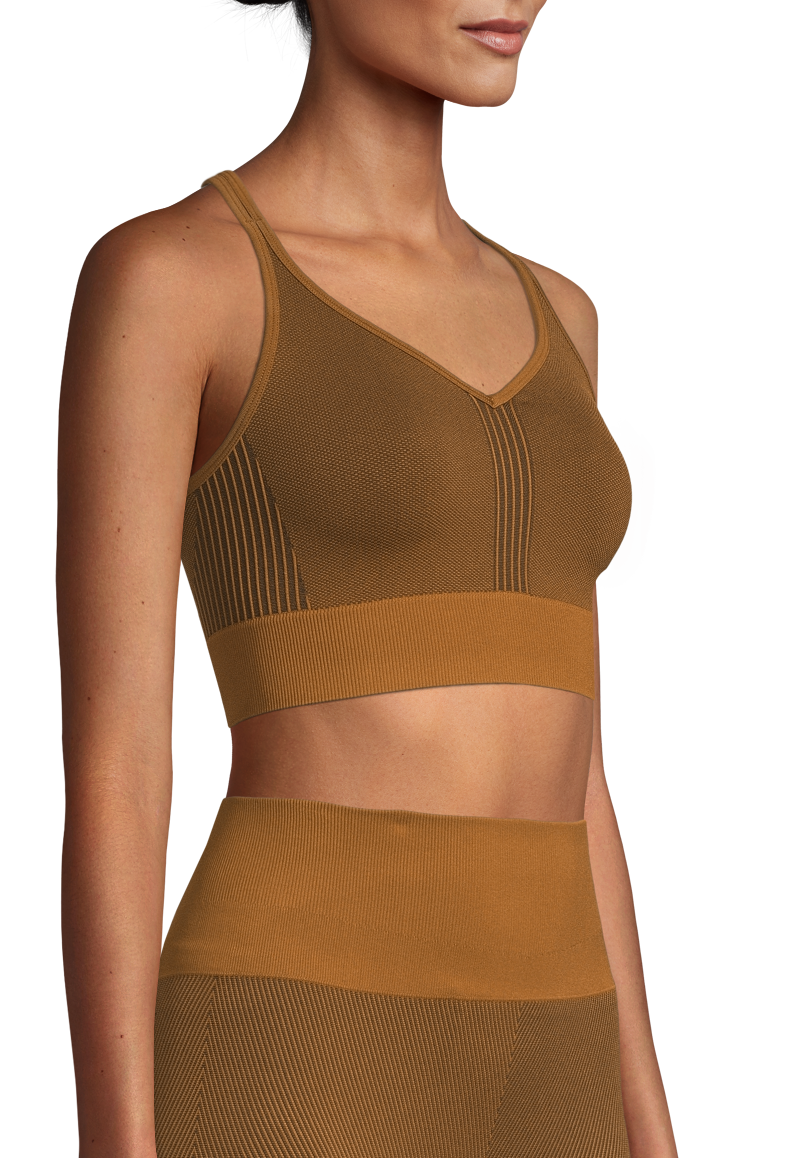 En ny favorit yoga-bh! En fin mönsterstickad design med mjuka färgkontraster. Det stickade materialet är gjort av ett återvunnet garn (lite tjockare ribbat material) som passar perfekt för yoga, rörelseträning eller en stunds meditation.